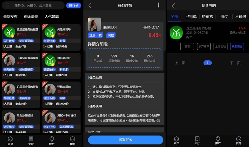 6、支持轮播图、公告、任务搜索、按人气、佣金、时间搜索等。