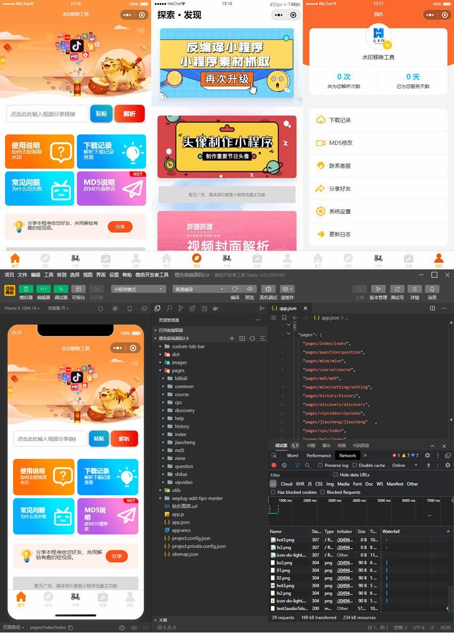 全网去水印独立版带解析接口小程序源码,服务器打包带小程序前端。含有三套颜色的小程序前端。