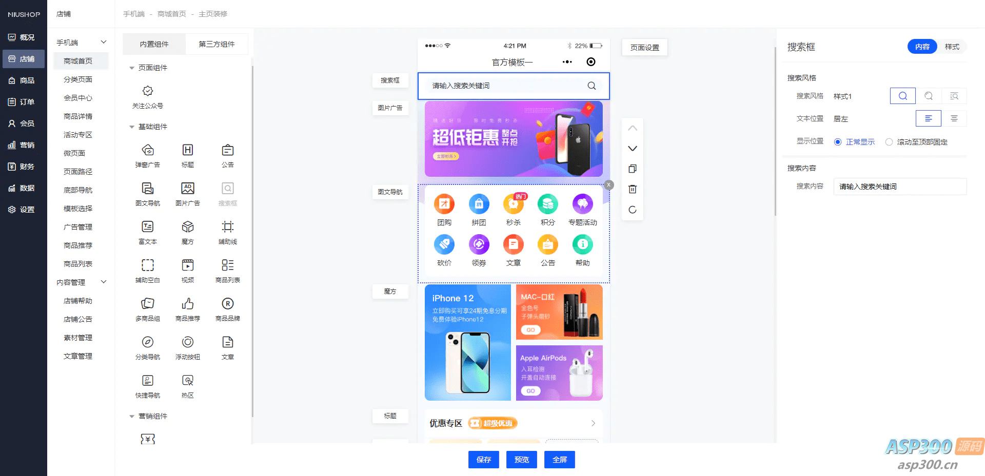 后台可以自由拖曳修改前端UI页面 还支持虚拟商品自动发货等功能 挺不错的一套源码