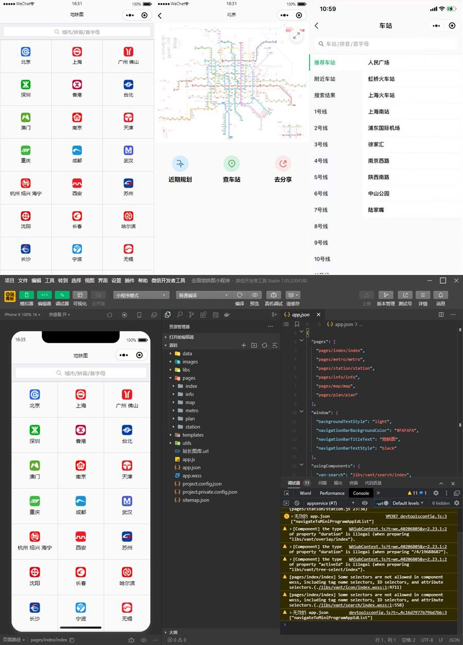 配置地铁图URL:考虑到地铁图更新的便利化,本项目将所有线路图放到服务器上,用户选择城市后会从服务器下载图片并缓存起来。(缓存时间为10分钟),你需要将地铁图源码中的的URL修改成你自己的URL。打开 data\city.js,修改metroMapUrl为你自己的网址即可。